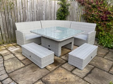 Ascot 3 Seat Sofa Dining Set with Rising Table considers the smaller outdoor living space whilst offering the option to move from day-time lounging to evening alfresco dining. The square rising table simply lifts from coffee to dining table positions teamed with the popular corner sofa group, and long footstools to maximize use and seating space.
