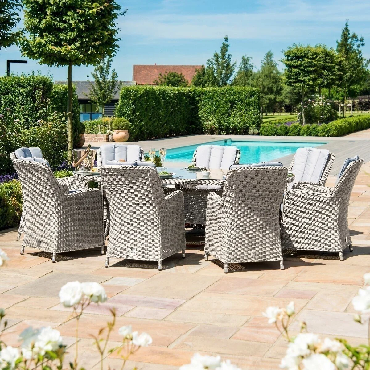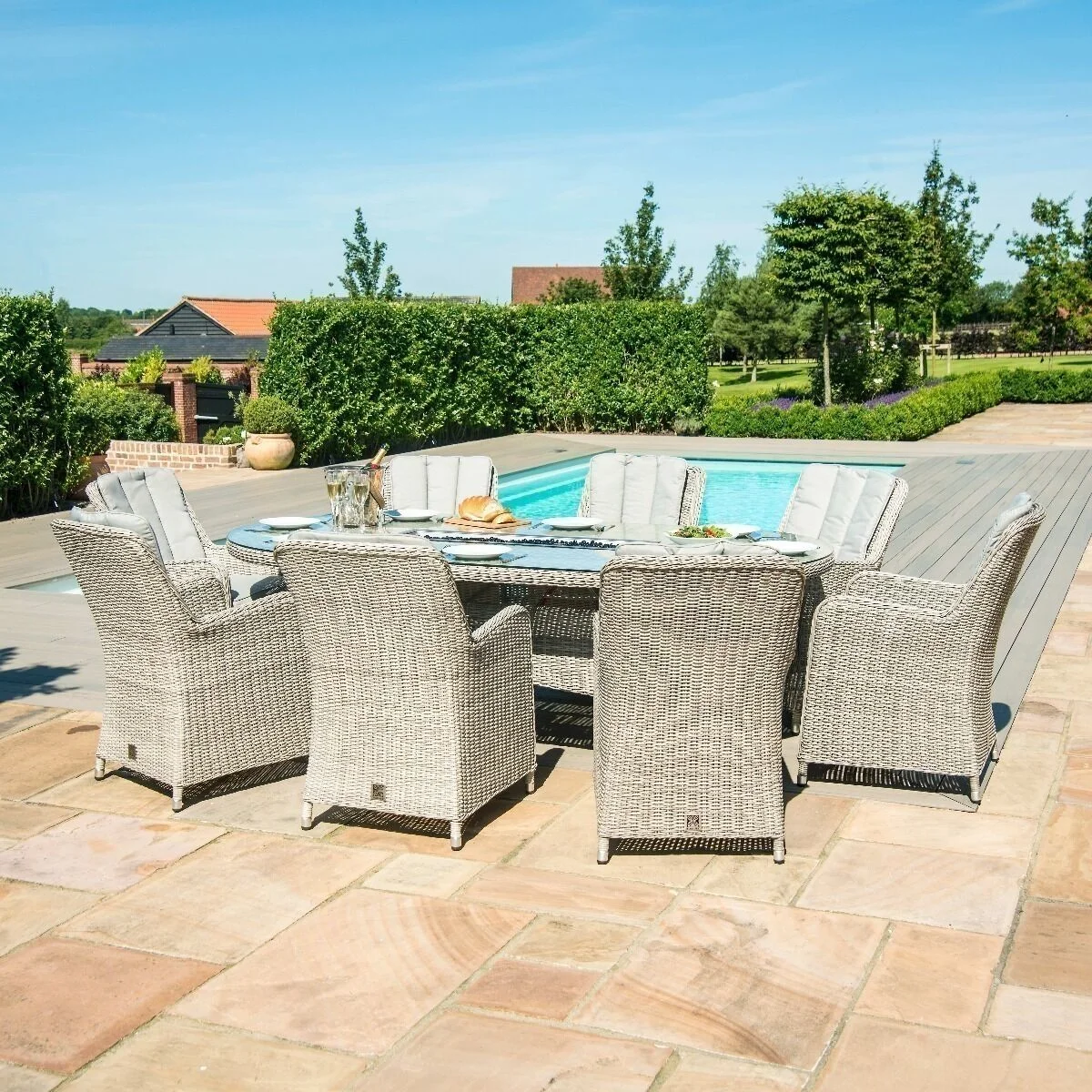 The Oxford 8 Seat Firepit Dining Set with Venice Chairs brings a touch of luxury to your al fresco dining. The oval table topped with toughened glass teamed with the eight comfortable chairs complete with base and back cushions to make this the perfect set to share breakfast, lunch, or dinner! In addition, this table has been integrated with a gas firepit system which will allow you to enjoy your garden furniture to the late hours in the evening. All of our firepit systems will accommodate a 5kg green patio gas bottle, which can be stored underneath the table.