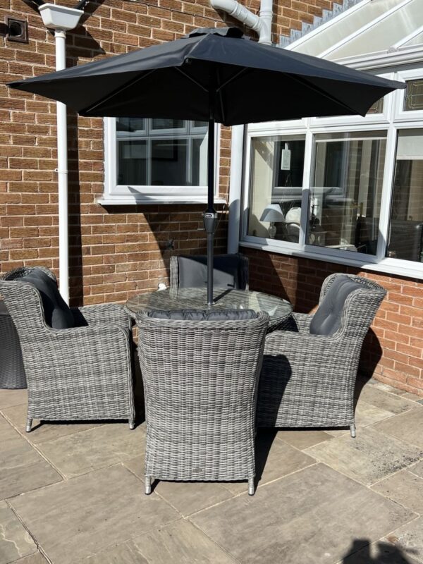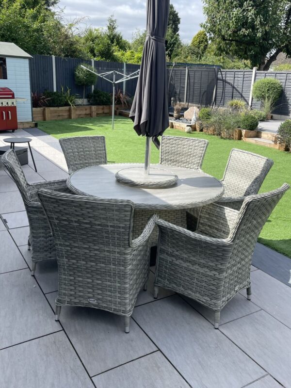 The Victoria 6 Seat Round Dining Set with Square Chairs is the ideal way to incorporate class and elegance to your al fresco dining. The round table, topped with toughened glass, is complemented with six stylish high back dining chairs complete with base and back cushions to make this the peak of indulgence. Purchase our round 2.7M grey parasol to match your dining set, the table comes with a parasol hole for you to be able to relax longer in the summer sun.