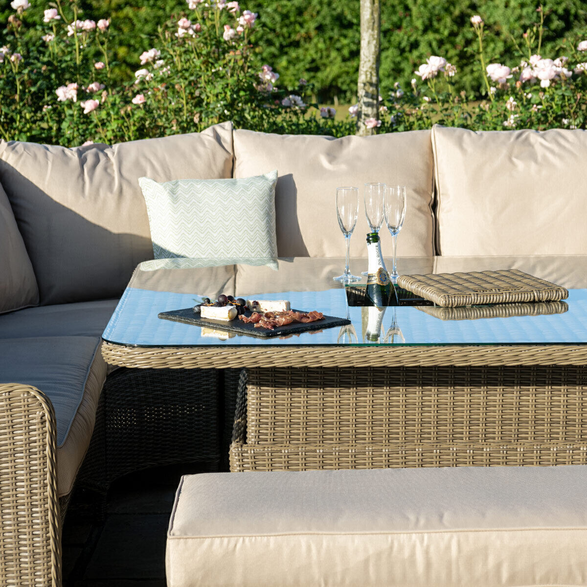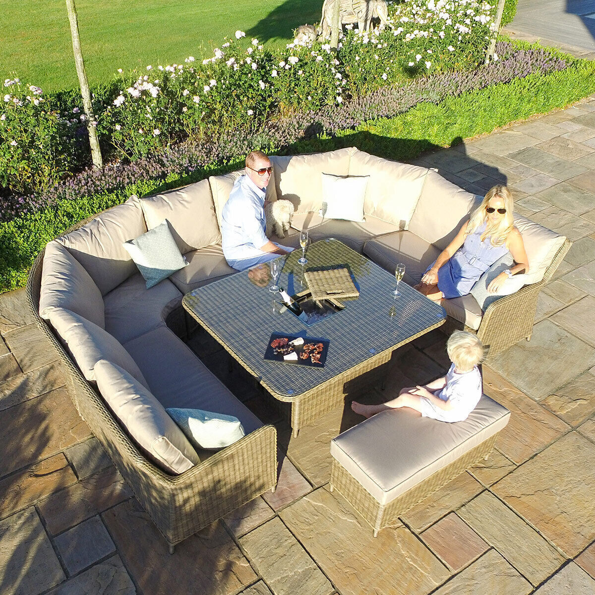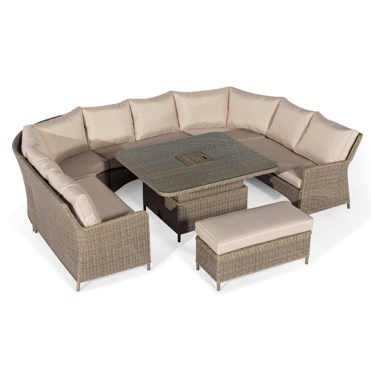 Our Winchester Royal U Shape Sofa Set with Rising Table is our largest and most intimate Rattan set created yet. It incorporates our versatile rising table which allows you to transform from dining to lounging with ease. The generous U-Shaped Sofas and additional bench bring everyone together to socialise in maximum comfort. This statement set will effortlessly transform your outdoor living space and give you the best garden experience with friends and family.